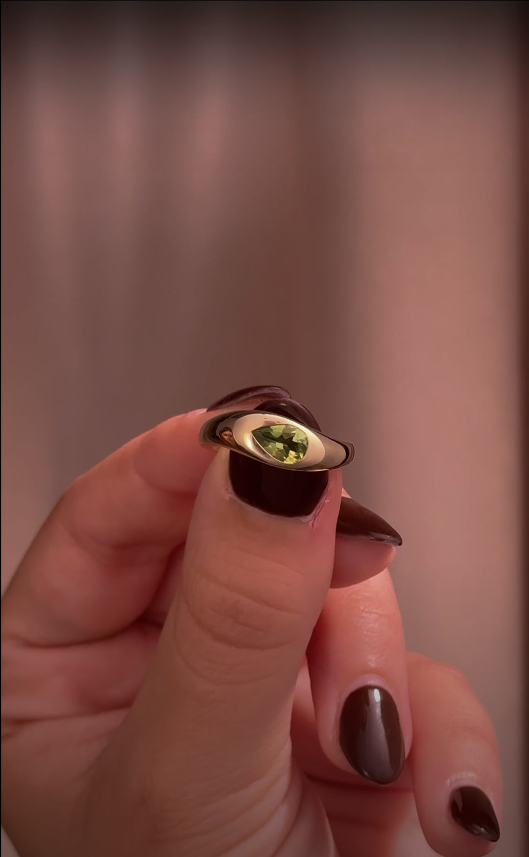 Liora frames its pear-cut green fire in sculpted 14k solid gold, letting light move through and around it — a jewel as luminous in spirit as it is in hand.