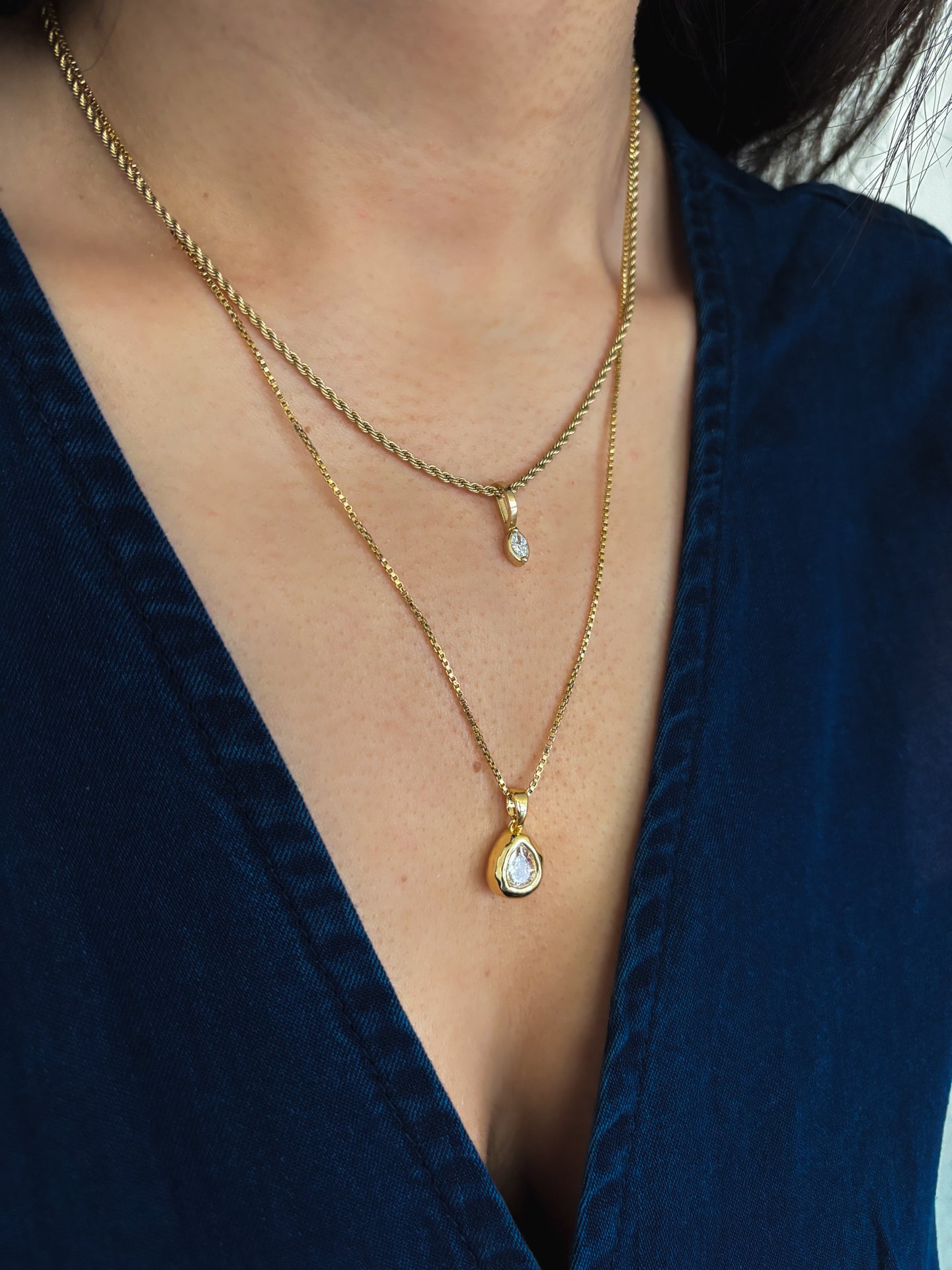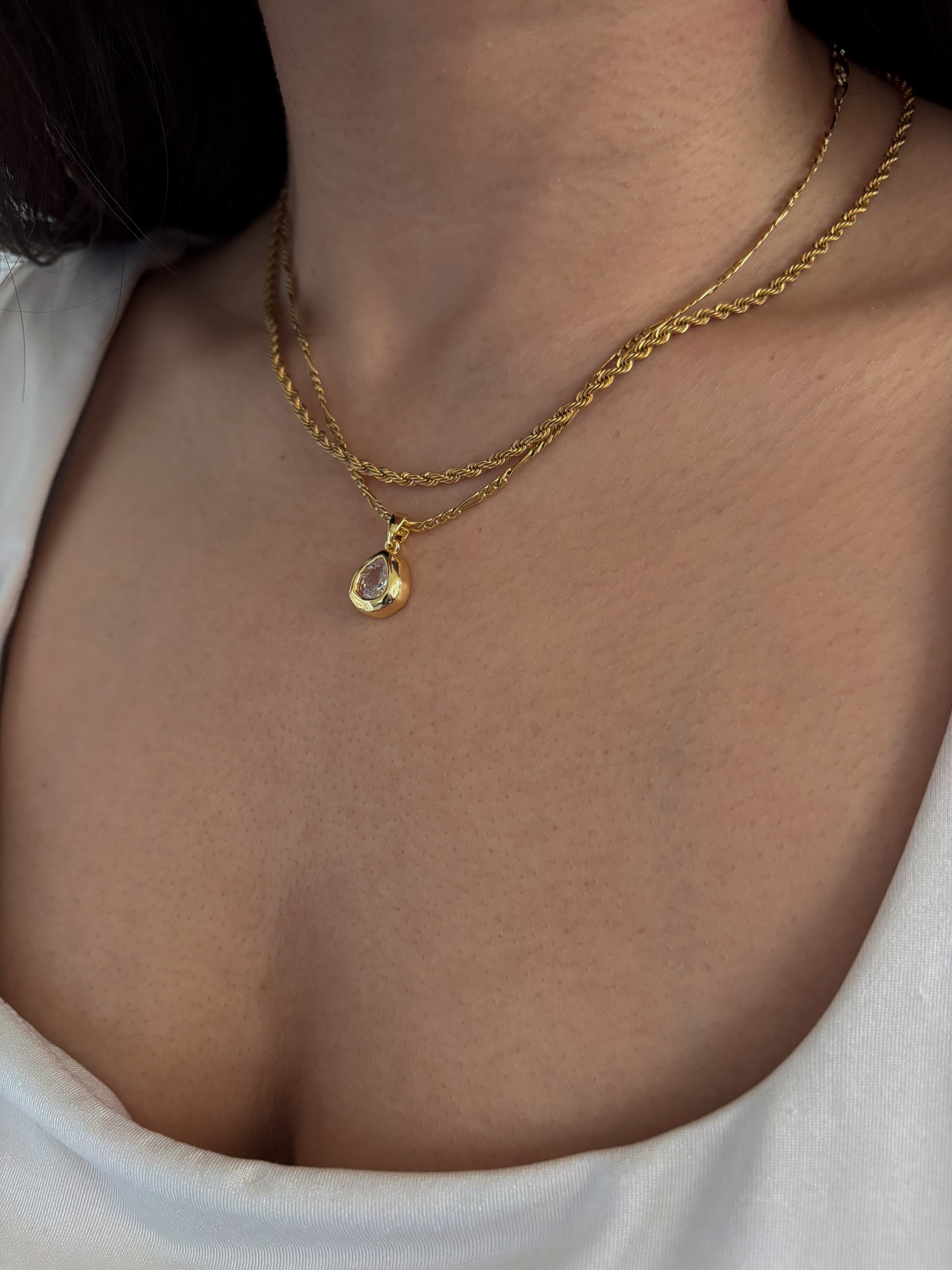 A delicate teardrop pendant with a softly hammered finish, set in a sleek bezel for a refined yet organic feel.